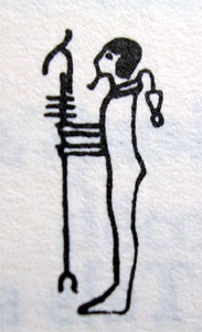 Signification: dieu PtahDescription: Dieu gainé debout, tenant le sceptre S40 (var.C20)Commentaires: Idéogramme ou déterminatif du nom du dieuSource: GM-03 - |