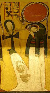 Signification: dieu Rê ?Description: Dieu à tête de faucon G5, coiffé du disque solaire et tenant S34 (gr.C1)Commentaires:Source: GM-03 - |