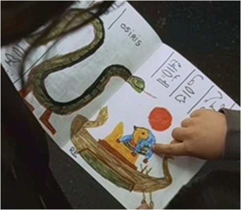 Petite scène autour d'un papyrus, redessiné par un gamin sur son cahier d'écolier.