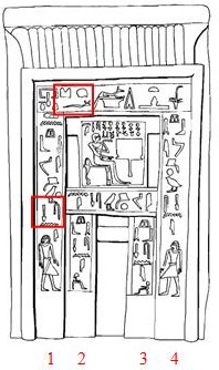 En exemple, nous allons étudier la stèle fausse-porte de Séni, dans laquelle nous voyons quatre lignes verticales, deux à droite et deux à gauche de l’ouverture centrale.