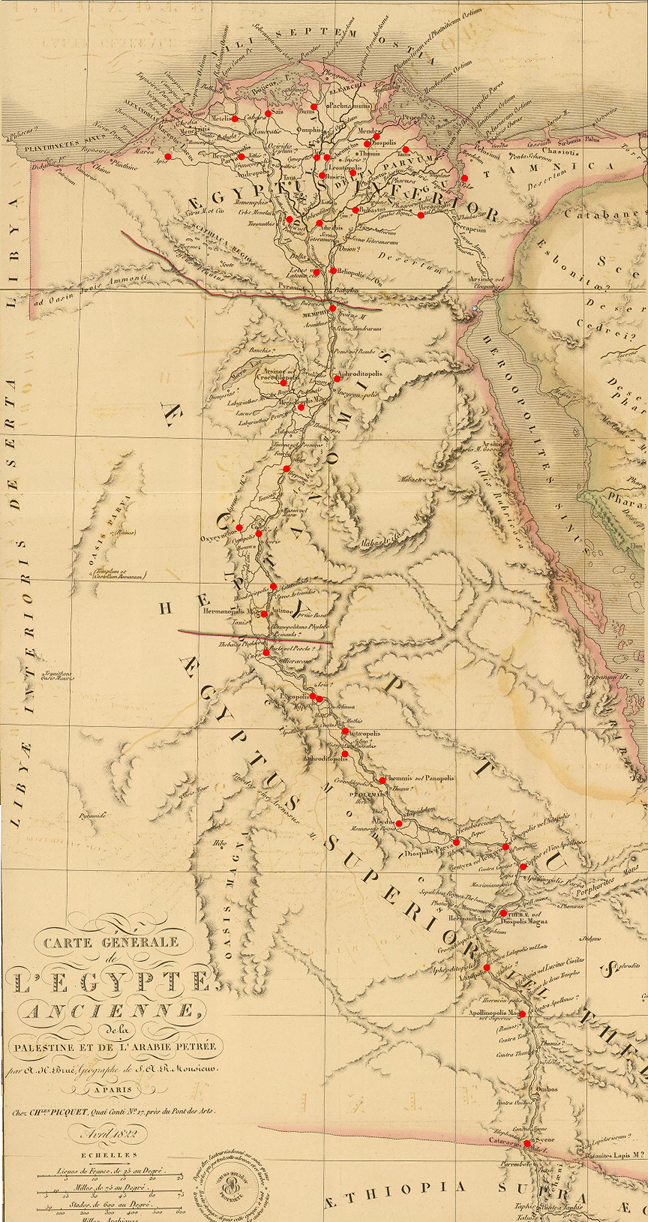 ) en égyptien, qui avaient été instituées au IIIe millénaire avant notre ère.Après 1870 avant J.-C., la carte de ces nomes-là ne correspond plus aux réalités administratives, mais la liste fossilisée de leurs capitales fut conservée traditionnellement jusqu’à la fin du paganisme, comme représentation idéale du pays dans le vocabulaire hiéroglyphique et dans l’iconographie des temples."