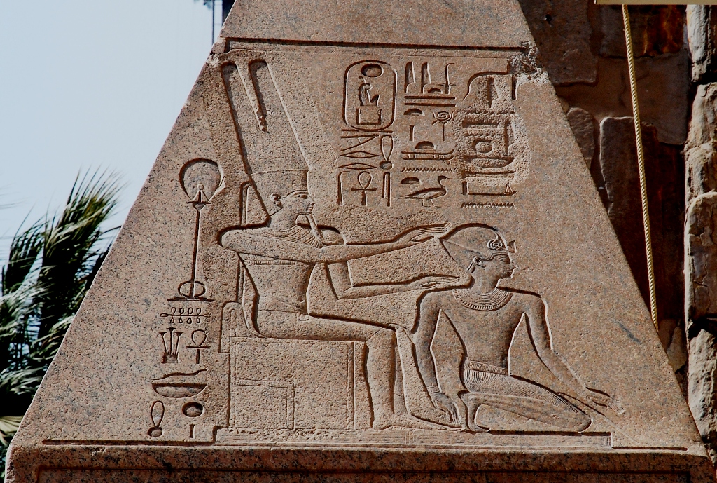 Ce pyramidion de l'obélisque F est le petit frère du E qui est toujours érigé. Sur ce relief on peut bien voir les retouches post-amarniennes (colonne de droite), et même la restauration de l'effigie du dieu Amon-Rê assis, le trône traduit bien une retouche succincte .