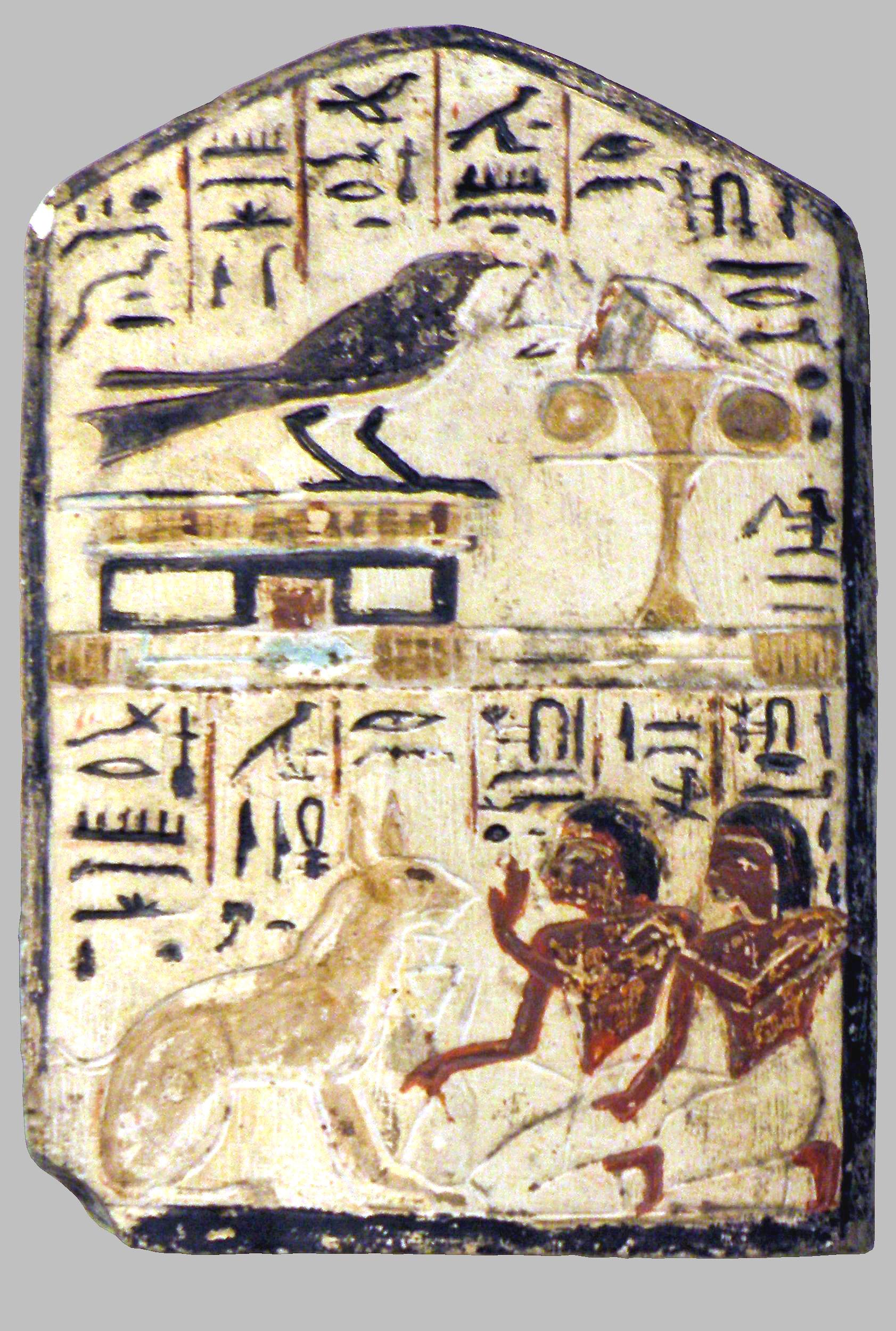 Dans le cintre et registre supérieur, le scribe Nebrê (dessinateur dans la vallée des rois, et résidant dans le village de Deir el-Médineh), dédie cette stèle à la belle et stable hirondelle, tandis que dans le registre inférieur, ses deux fils, Nakhtamon et Khây, scribes eux aussi, adorent la belle et stable chatte.