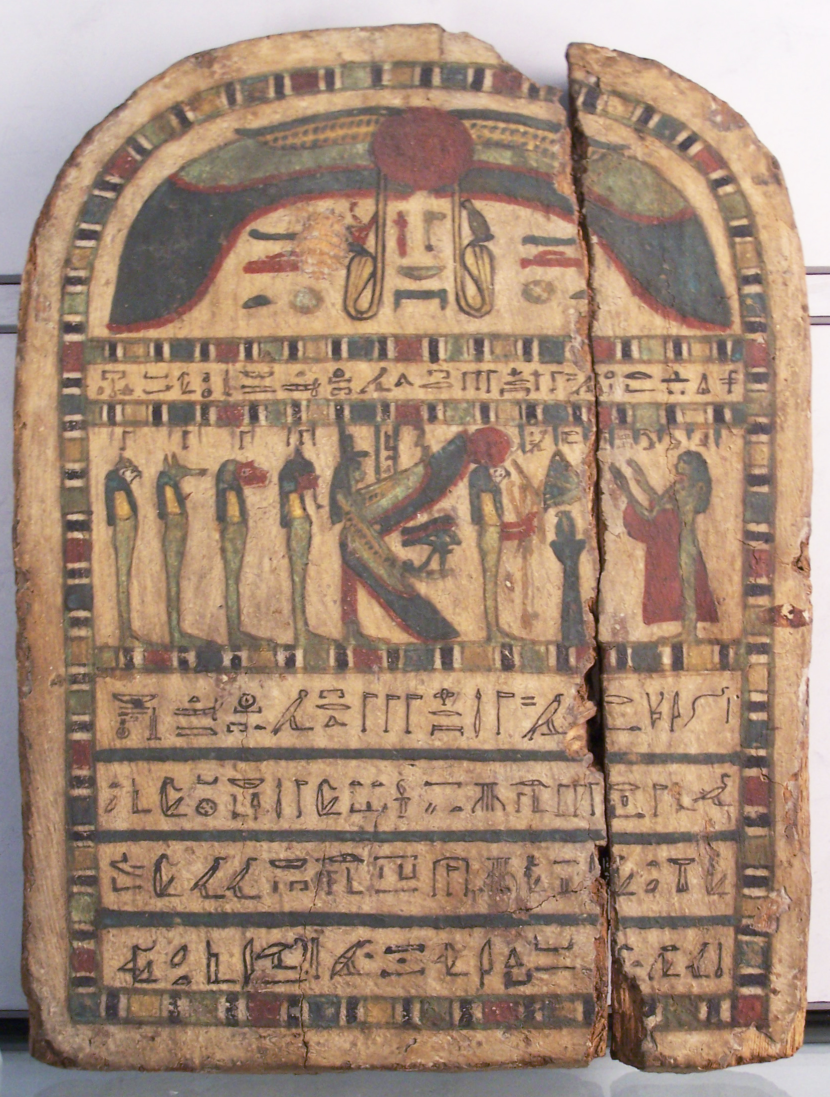 La Stèle montre Ouou en adoration devant six divinités : Rê, Isis, ainsi que quatre autres divinités qui peuvent être interprétées comme les quatre divinités protectrices des viscères. Dans l'ordre, de droite à gauche, sont ainsi représentés : Amset (l'homme), Hâpi (le babouin), Douamoutef (le chacal) et Qebehsenouf (le faucon).