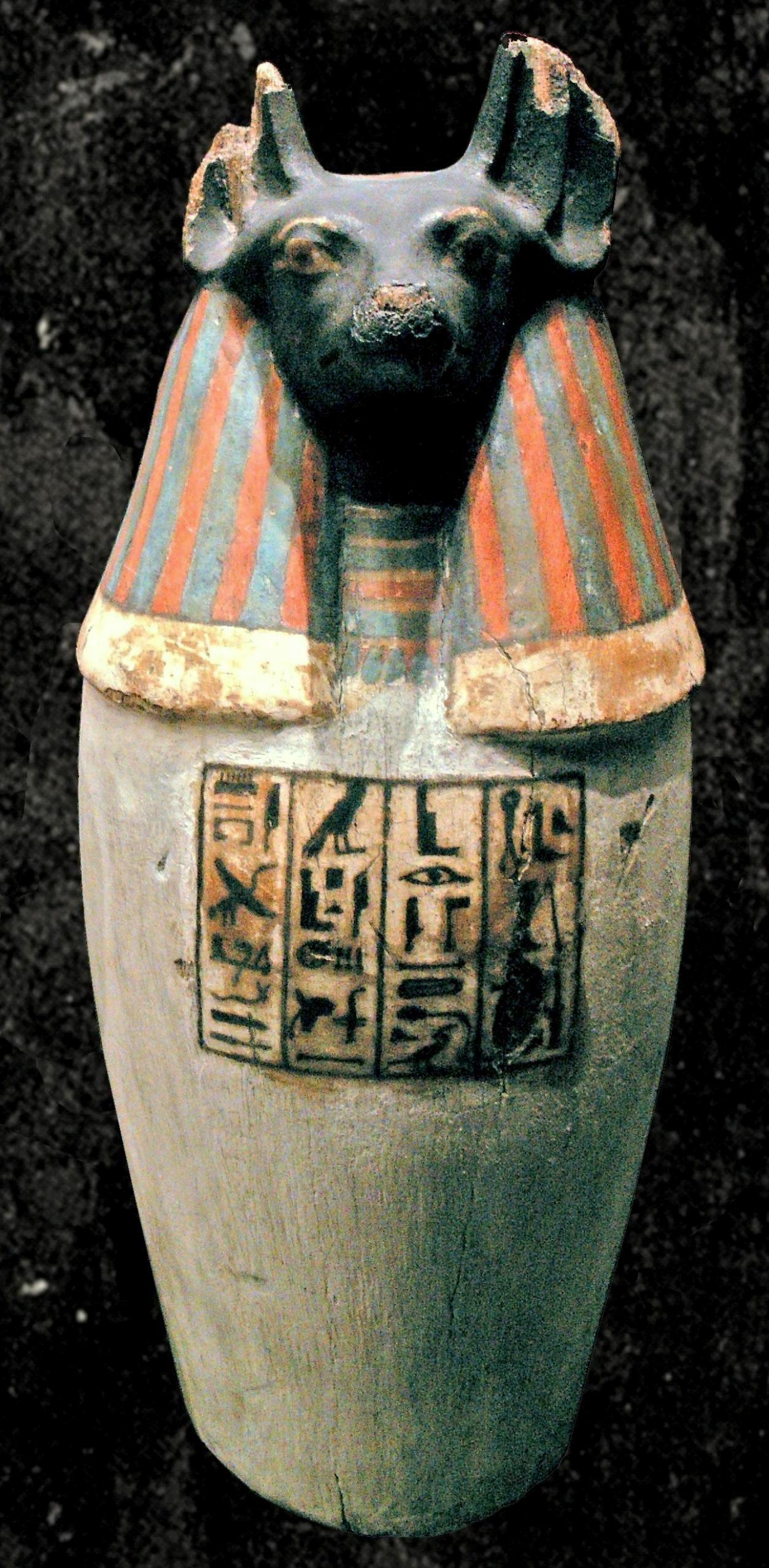 Tirant leur nom de la ville de Canope, ces vases ne contiennent rien, pas même une cavité ! En effet à cette époque, on retransférait les viscères traités pour la momification dans le corps du défunt. On a cependant conservé l'usage de ces vases pour appeler la protection des génies, les quatre fils d'Horus, sur les viscères auxquels ils étaient associés. A noter une inversion des noms des deux génies Douamoutef et Qebehsenouf (remarque de Marianne L.). Le nom du premier (Douamoutef) étant normalement associé à un vase à tête de canidé, le second (Qebehsenouf) à un vase à tête de faucon et non l'inverse comme ici.