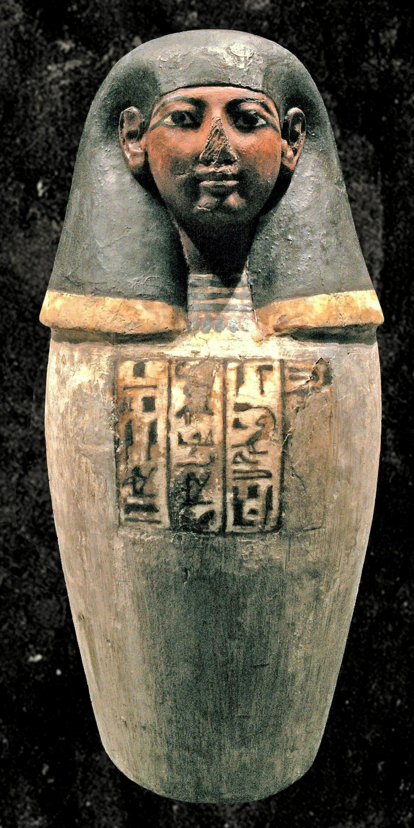 Il y a souvent eu des "brassages" entre les vases portant le nom et les couvercles. Ce n'est pas le cas ici puisqu'il s'agit de vases factices où la tête est solidaire du corps du vase.