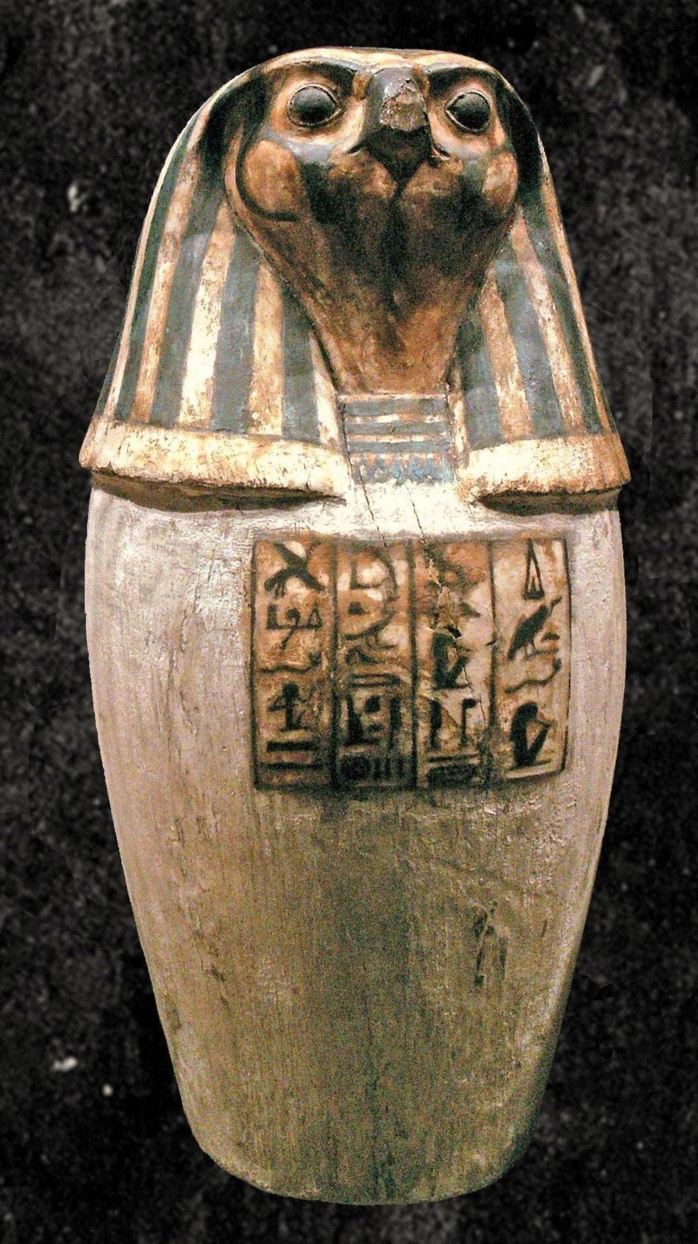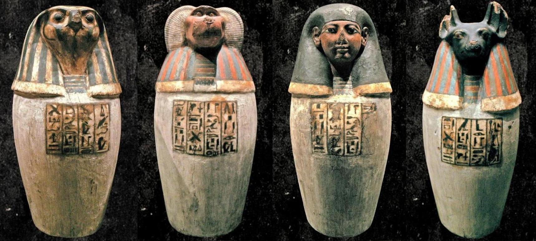 "Au Moyen Empire, ..., les formules identifiant le défunt aux quatre frères (CT, spells 520-523) sont inscrites à l'intérieur des coffres à canopes alors que, sur les faces externes de ceux-ci et sur les vases eux-mêmes, apparaissent les courtes inscriptions associant leurs noms à ceux des grandes déesses protectrices ; dès lors, on retrouve toujours les mêmes correspondances entre le contenu des vases, leurs bouchons à l'effigie des quatre dieux et les quatre déesses qui les assistent : malgré quelques confusions, le foie, les poumons, la rate et le reste des organes internes, constitué surtout par les intestins, sont placés respectivement sous la protection d'Amset (tête humaine), Hapy (tête de babouin), Douamoutef (tête de chien) et Qebehsenouf (tête de faucon), chacun d'eux étant à son tour protégé par Isis, Nephtys, Neith et Selqet."