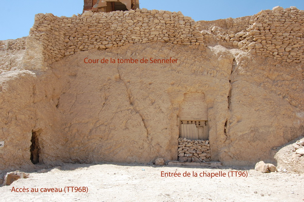 Le monument funéraire de Sennefer est situé sur le flanc sud du cimetière de Cheikh Abd el-Gourna. Il est composé d'une chapelle (TT96A) et d'un caveau (TT96B), l'un des rares à être décoré dans cette partie de la nécropole. La treille qui recouvre son plafond lui vaut son surnom de "tombe aux vignes."
