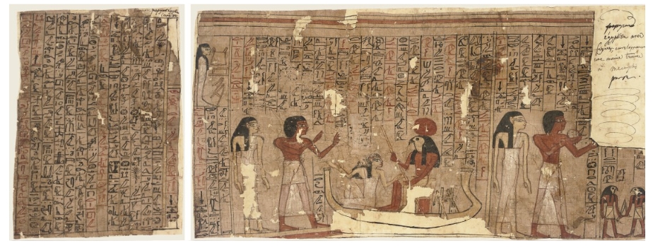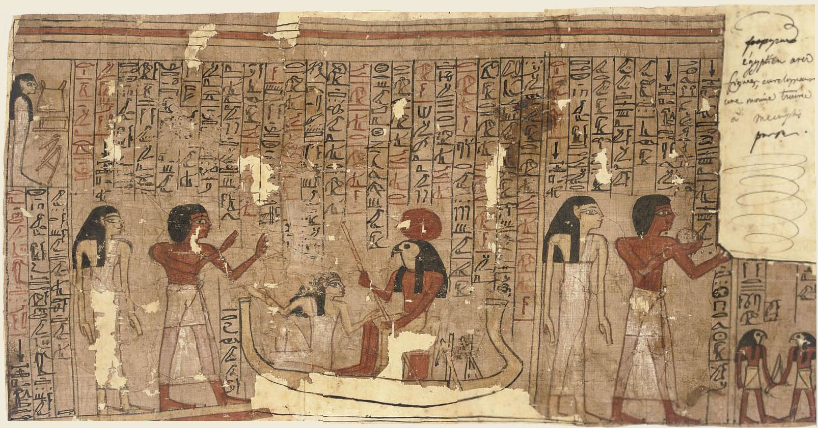 NB.: une inscription à l'encre indique "... papyrus égyptien ... figures enveloppant une momie trouvée à Memphis". Cependant, il est plus probable que l'origine soit thébaine.
