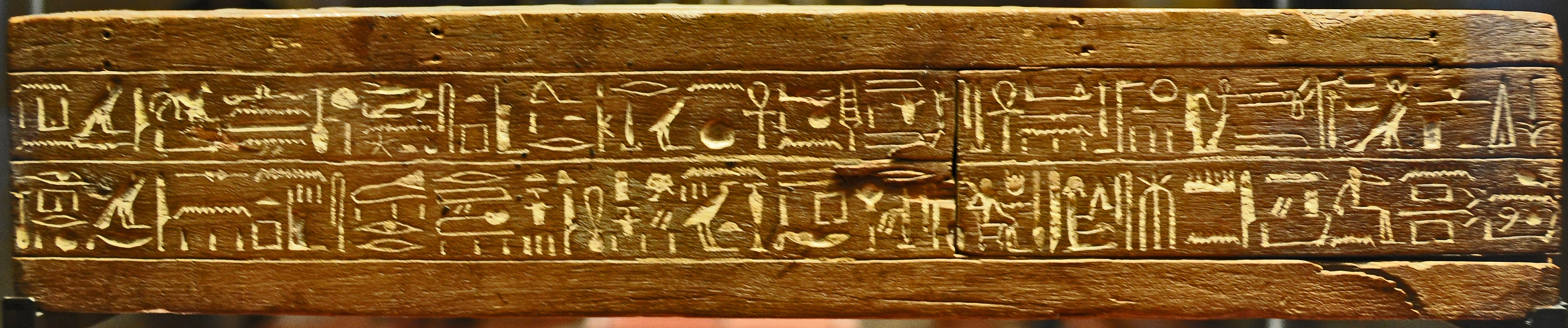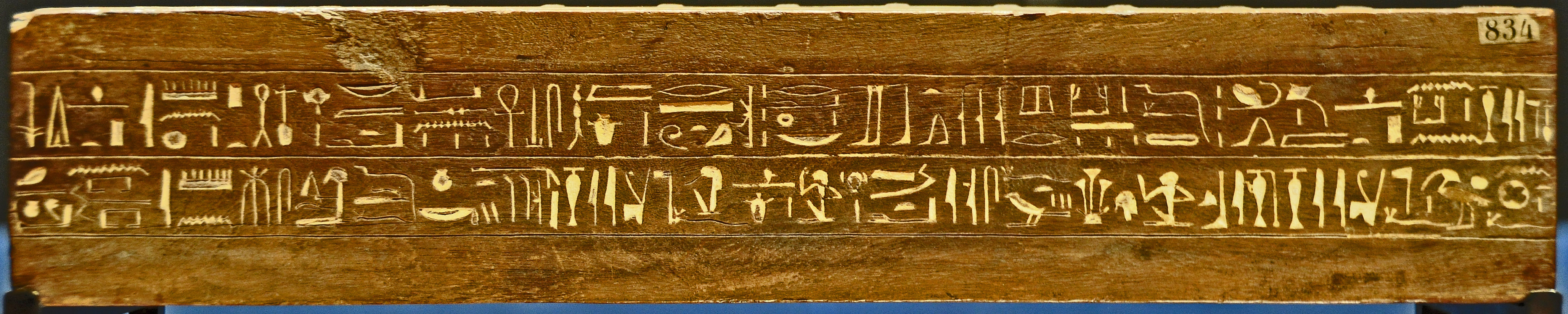 "Sur la face inférieure, damier pour le jeu de "sénet" (à 30 cases) ; sur la face supérieure, damier pour le jeu de 20 cases ; sur le petit côté, Imenmès est représenté jouant au "sénet", avec deux séries de pions et des osselets."
