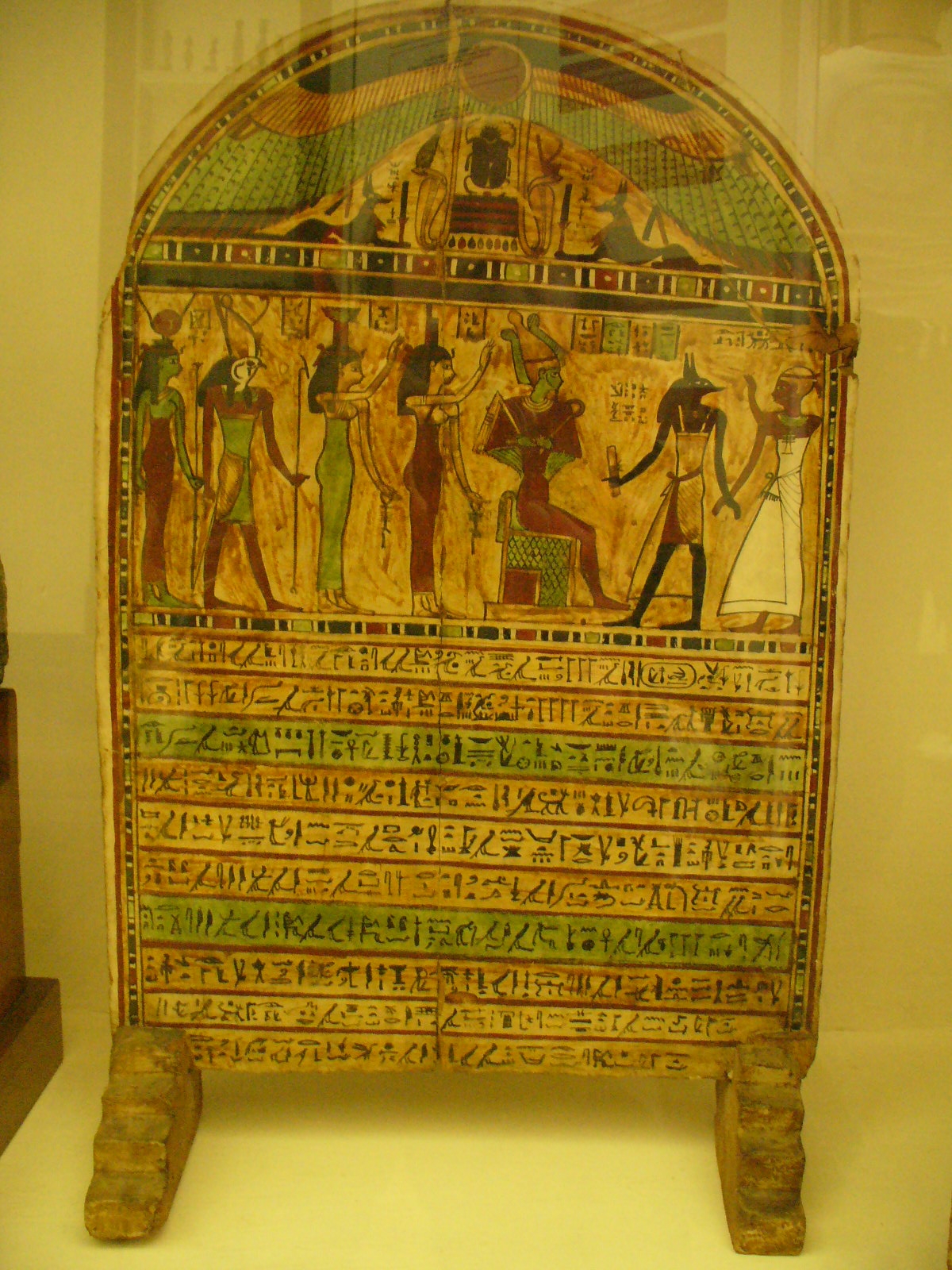 - Registre inscrit : dix lignes de texte séparées par de larges traits rouges, hiéroglyphes peints en noir dans des bandes alternant les couleurs ocre, marron et vert clair.