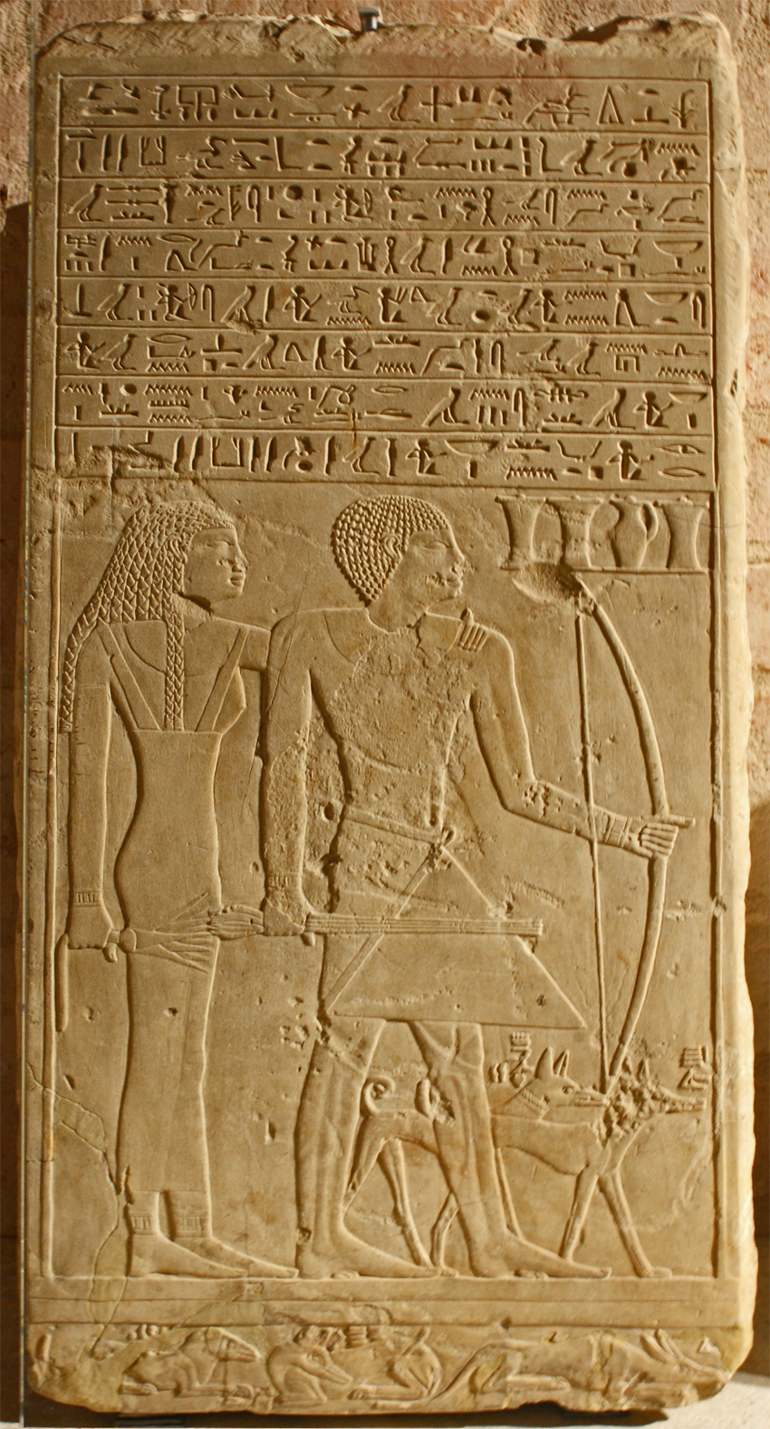 Stèle de Kay, chef des chasseurs du désert, avec sa mère et ses chiens favoris.