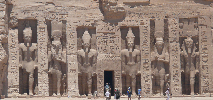 Façade du petit temple d'Abou Simbel, construit par Ramsès II , consacré à la déesse Hathor, maîtresse d'Ibshek, et à la Grande Epouse Royale Nofertari. Elle présente 6 statues d'environ 10m de hauteur ( 4 représentant Ramsès II et 2 représentant Nofertari ) encadrées d'un décor épigraphique que Christiane Desroches-Noblecourt et Charles Kuentz décomposent en deux éléments : un premier complexe extérieur composé des 2 textes horizontaux du haut et des textes verticaux à droite et à gauche et un complexe central composé des textes verticaux de la porte et des textes horizontaux et verticaux entourant les deux colosses proches de la porte. Les textes des deux contreforts centraux à droite et à gauche sont à lire comme la suite de chaque contrefort extérieur.