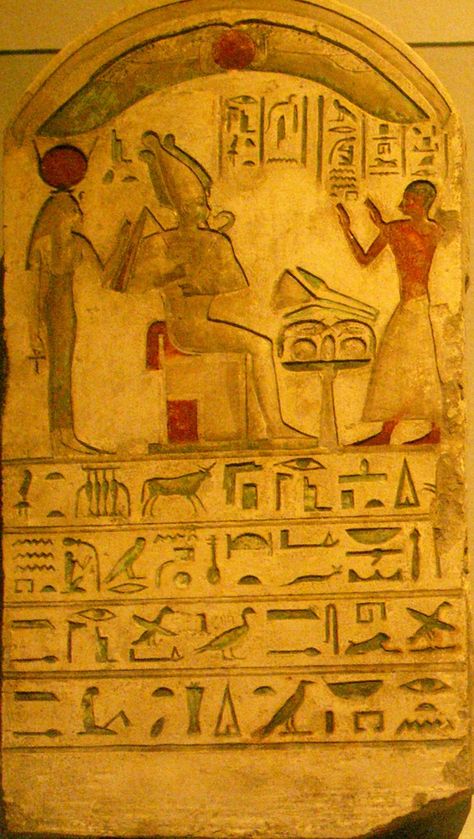 Kalkstein, bemalt, vermutlich aus Memphis, Spätzeit, wobl 27. Dynastie, um 500 v. Chr., 1821 durch Ernst August Burghart erworben, ÄS 185Unterhalb der gewölbten Himmelshieroglyphe und der Flügelsonne ist die Verehrung des thronenden Gottes Osiris und seiner Schwester Isis durch den Vorsteher der Reinigungspriester Pa-sehers dargestellt. In der Opferformel darunter wird "Osiris-Apis-Chontamenti, Gropher Gott und Herr von Rosetau" angeröten Inschribten und [... illisible ...] der Stele aus dem memphitischen Raum.