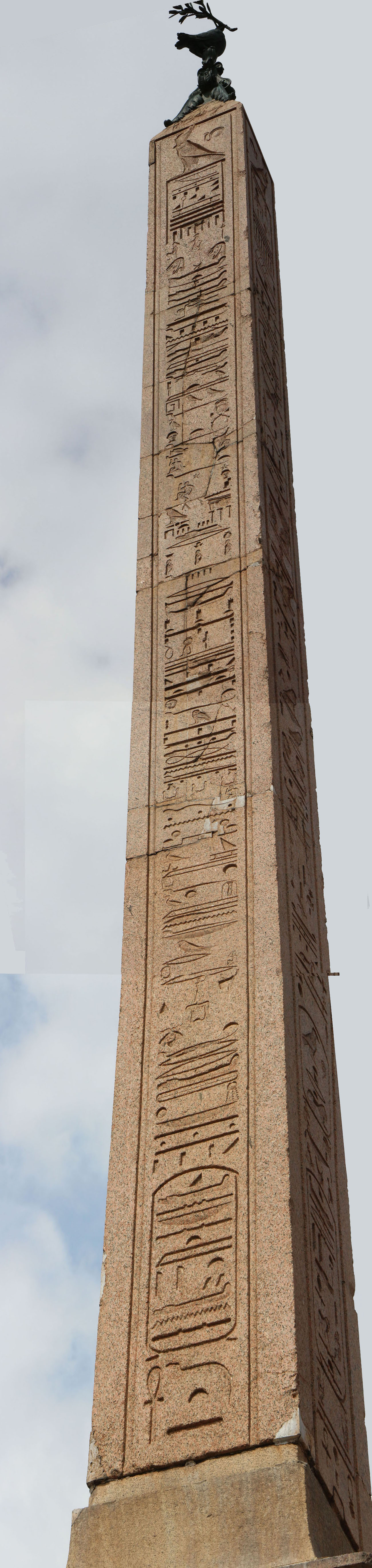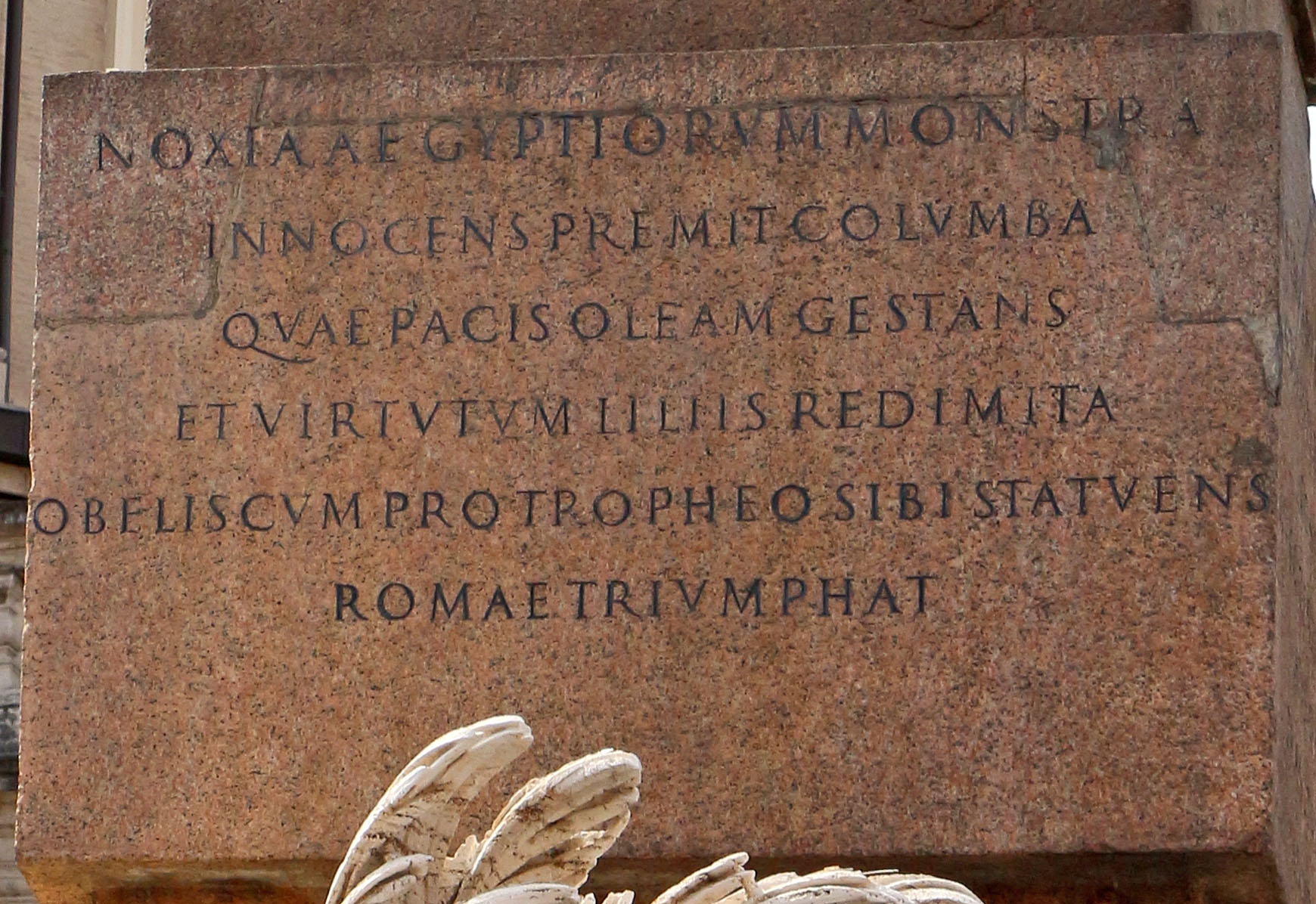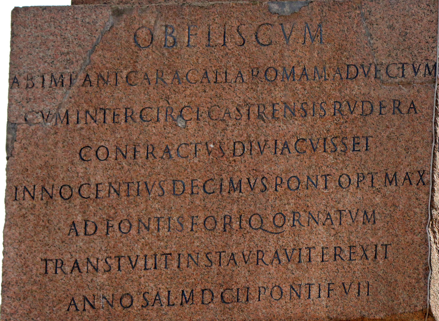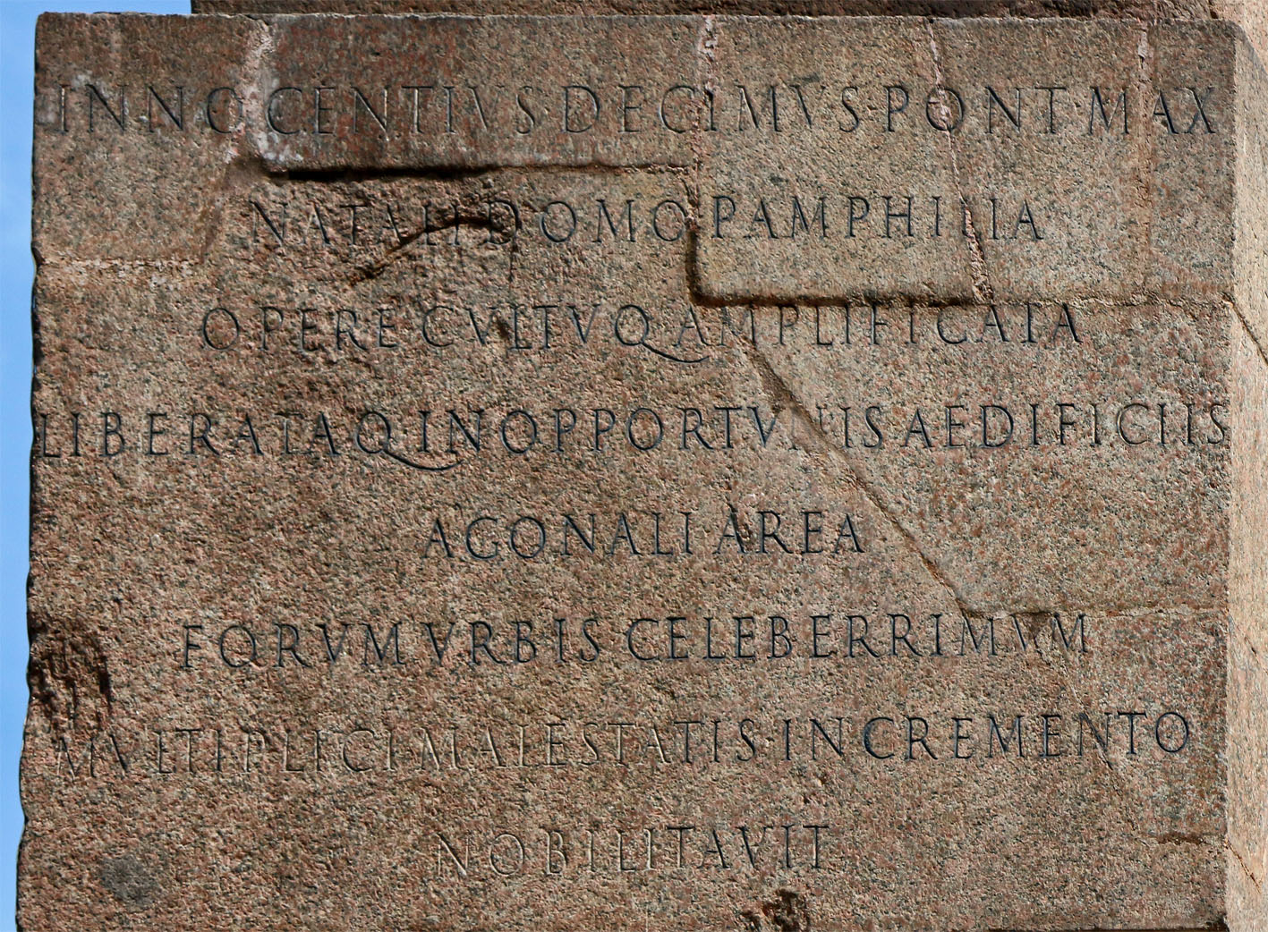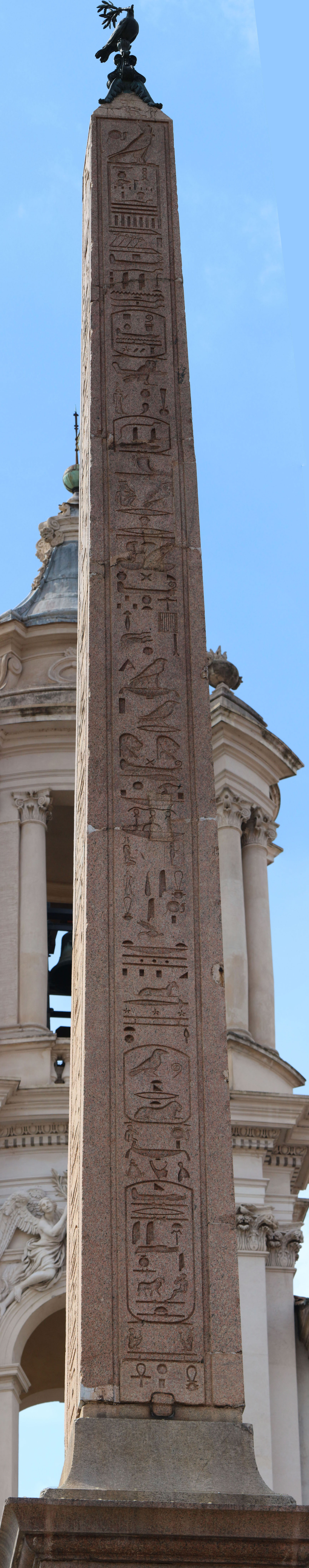 Quant à l'obélisque [Iversen, I, p.76-92] de la place Navone, c'est un monument d'époque romaine en granit rouge. Erigé à Rome peu après l'accession de Domitien en 81 de notre ère, il est d'abord placé dans l'Iseum du Champ de Mars. Au début du IVe siècle, il est déplacé dans le cirque de Maxence sur la Via Appia [A. Roullet, p.72-73]. En 1648, le pape Innocent X, peut-être à la suggestion d'A. Kircher (1602-1680) [W.-R. Dawson, E.-P. Uphill, p. 229] , le fait déplacer à la Piazza Novona où se trouve le palais des Pamphili, la famille du Souverain pontife. En 1649, le monument est posé sur la Fontaine des Fleuves du Bernin.