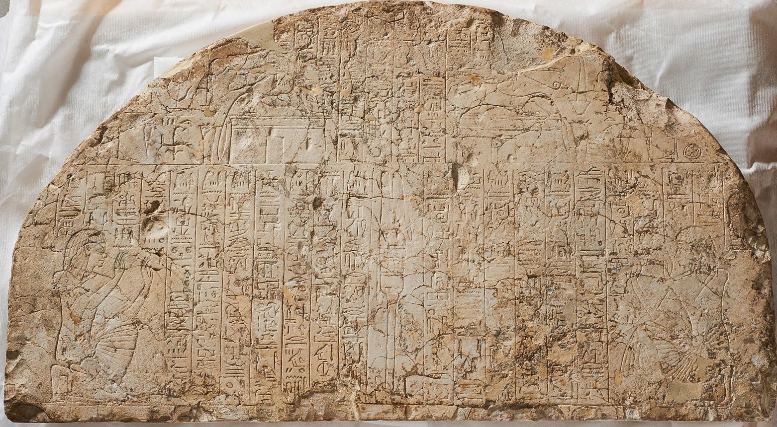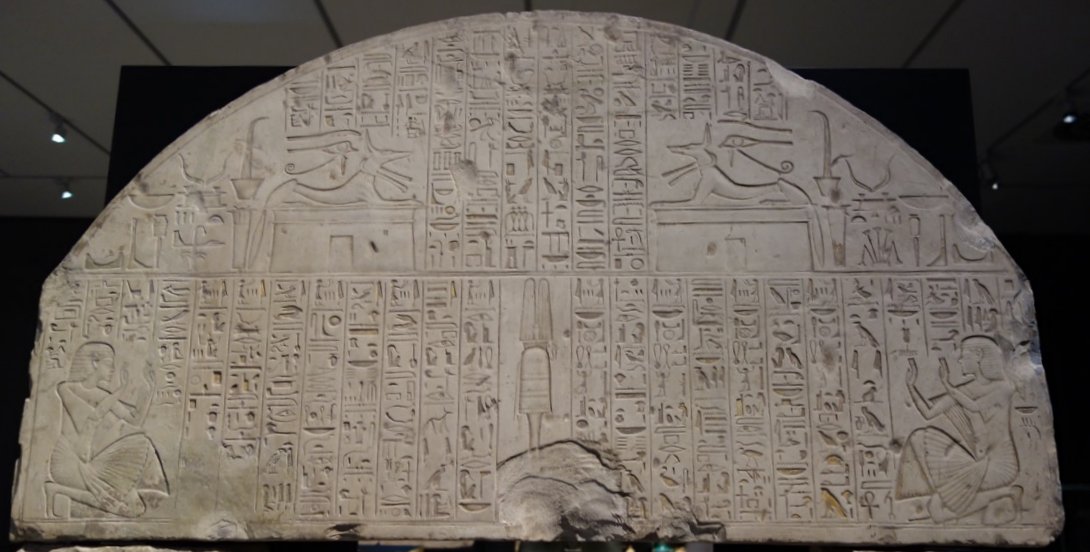 L’autre stèle dite de « Vienne » est beaucoup plus dégradée. On y retrouve la même structure que pour celle de Leyde :cintre ,divisé en deux parties, puis deuxième registre, divisé également en deux parties. Mais là nous n’avons pas les piliers.