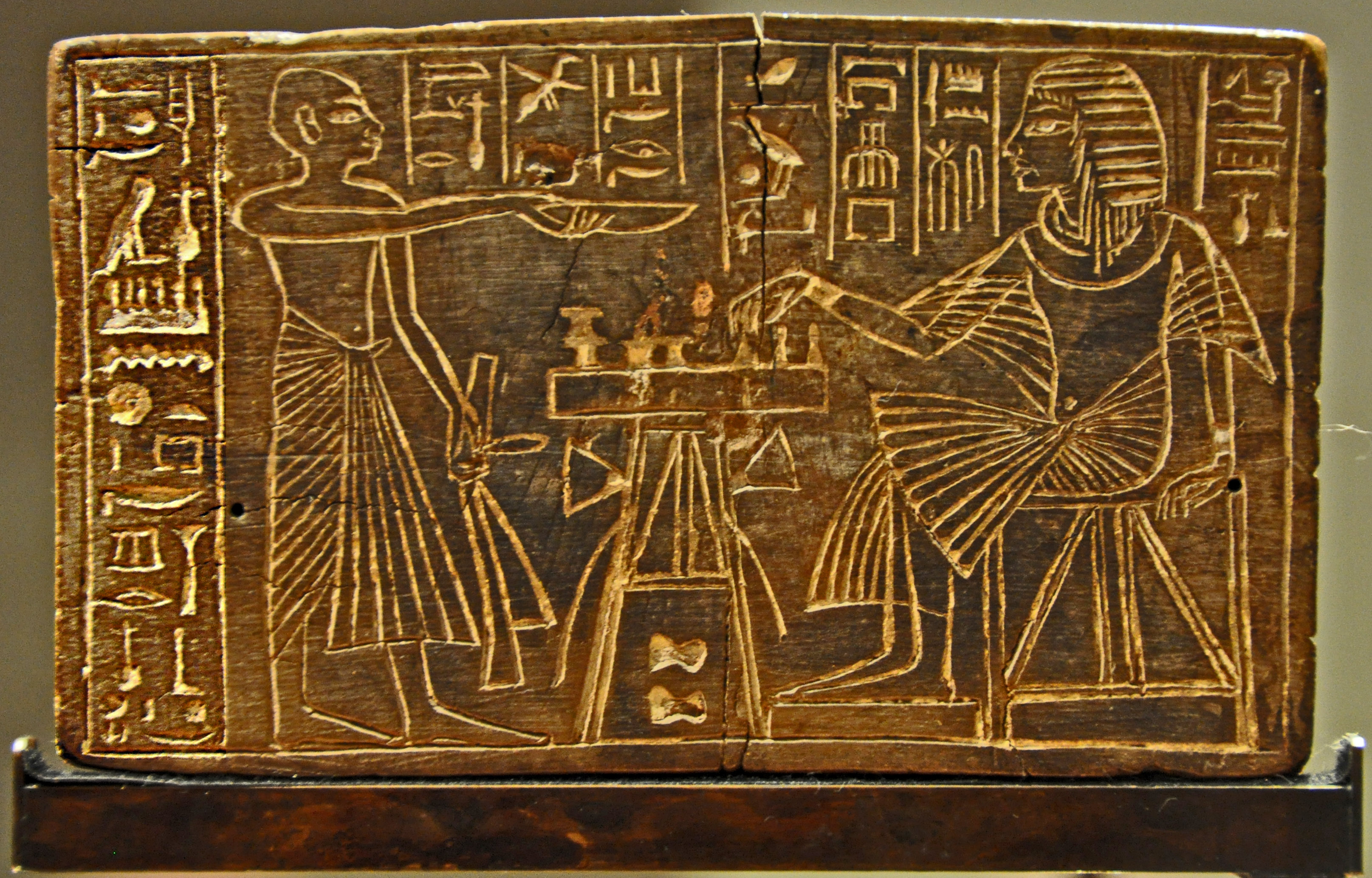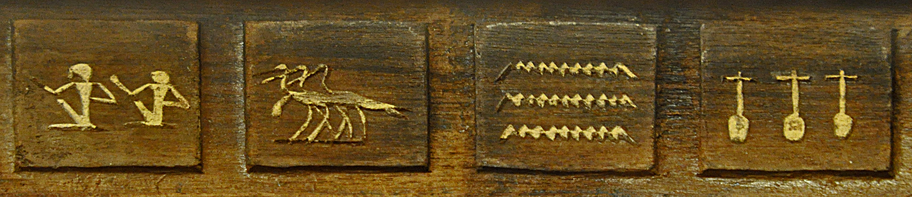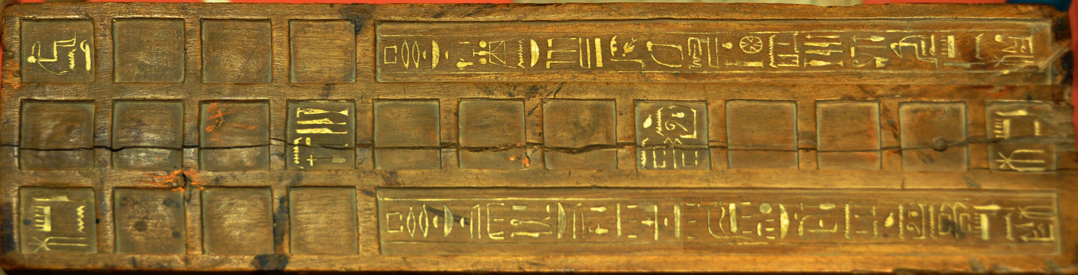 Sur la face inférieure, damier pour le jeu de "sénet" (à 30 cases) ; sur la face supérieure, damier pour le jeu de 20 cases ; sur le petit côté, Imenmès est représenté jouant au "sénet", avec deux séries de pions et des osselets."